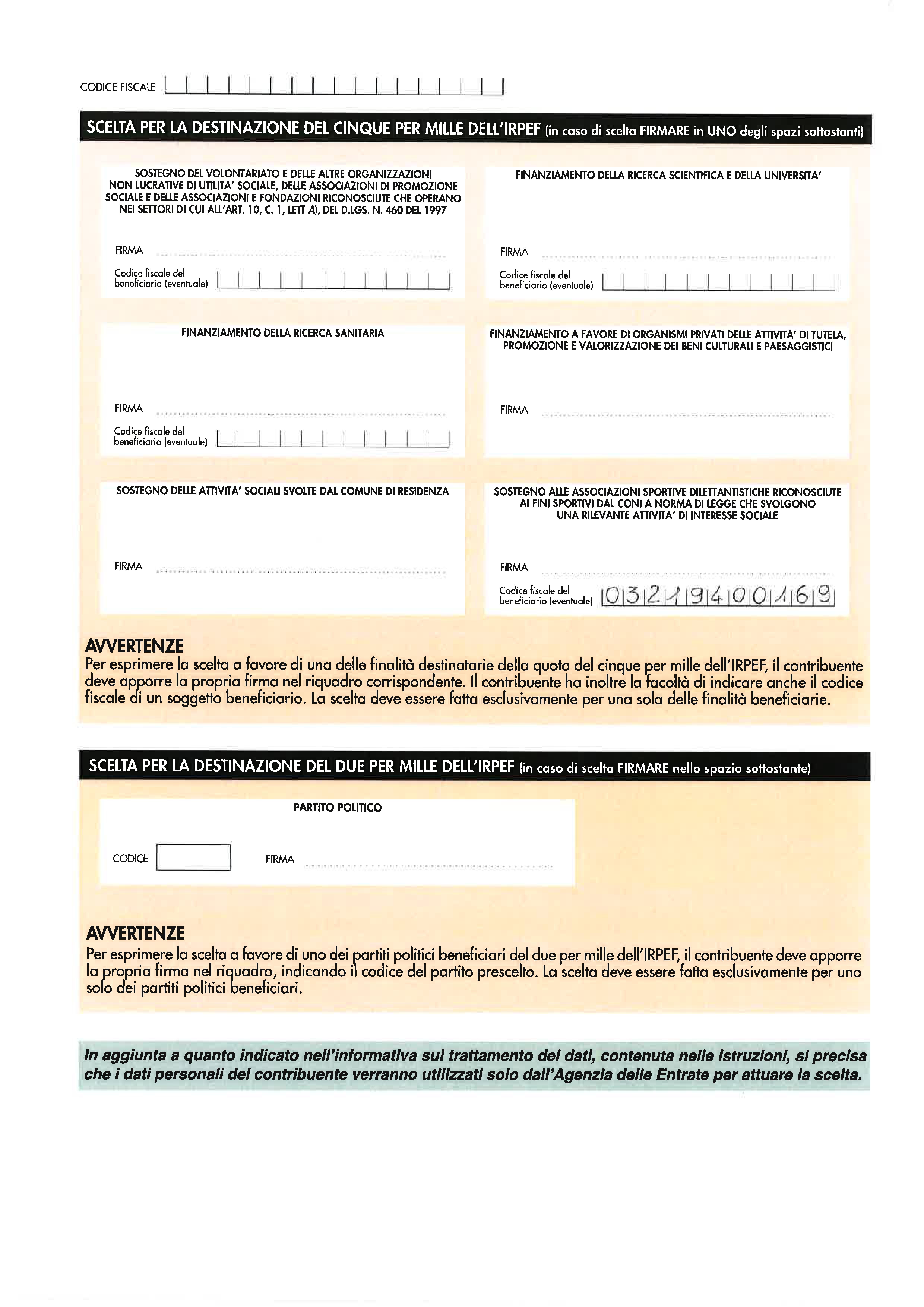 Inserisci il nostro Codice Fiscale 03219400169 e firma nel riquadro dedicato alle Associazioni Sportive Dilettantistiche, così come nel fac-simile qui sotto.